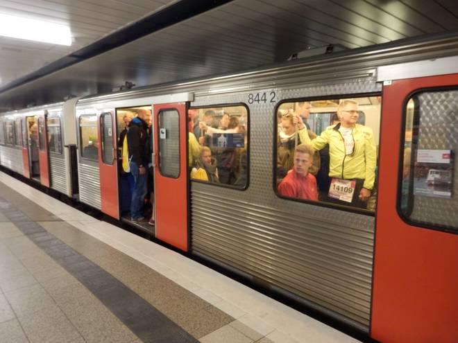 U-Bahn Schlump 14.33 Uhr Den Lautsprecher-Hinweis, die nächste Bahn käme in nur einer Minute, wollte wohl keiner hören. Ich wartete die Minute und bekam einen Sitzplatz und Beinfreiheit. :-) |
