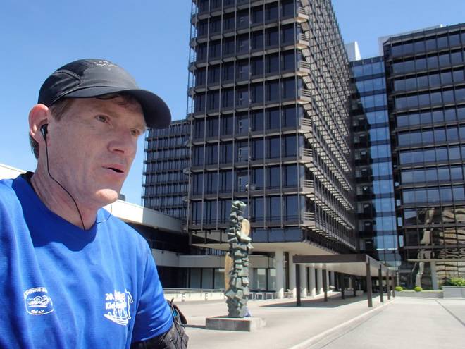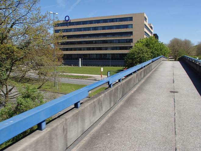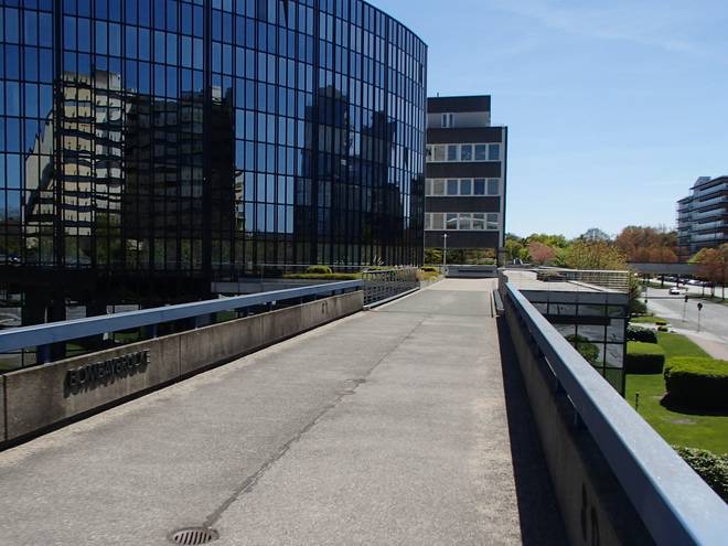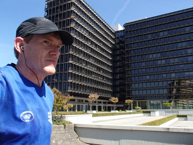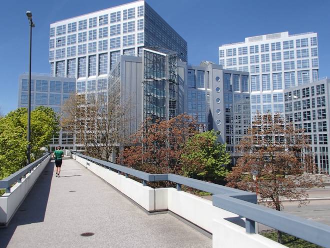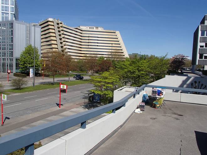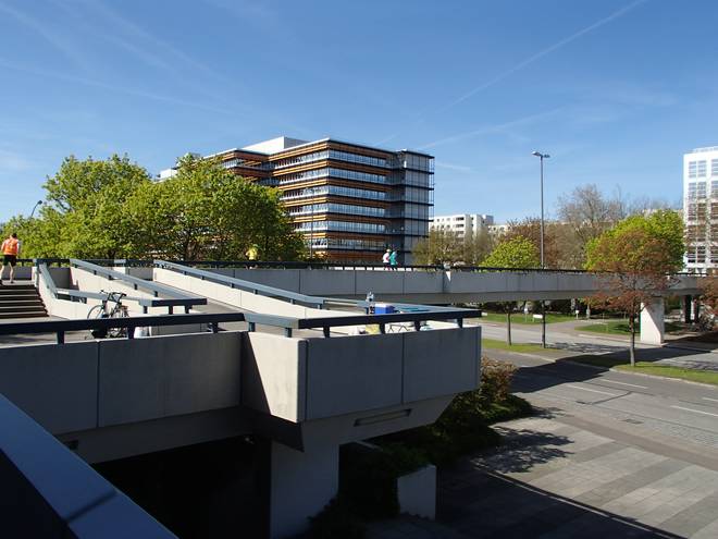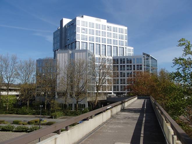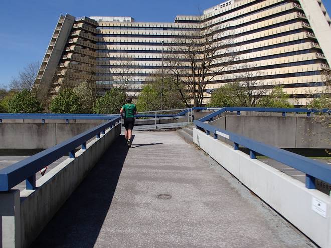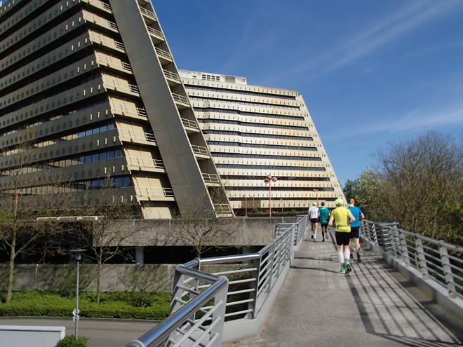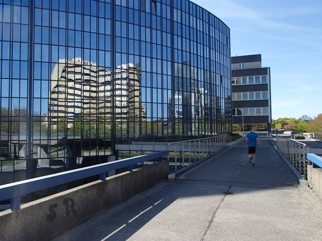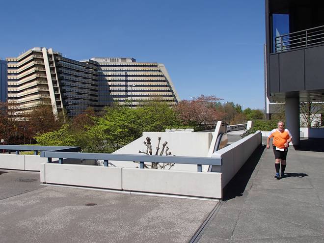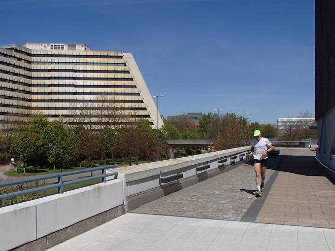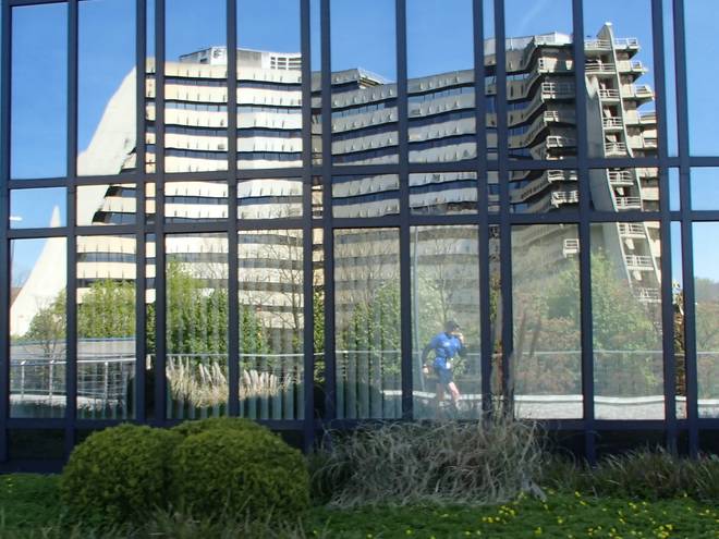 Runde 18 11.36 Uhr / Km 15,1 Die BKK Taunus und die RWE sitzen in diesem Gebäude am Überseering 34. Und man spiegelt sich prima in den Scheiben. |