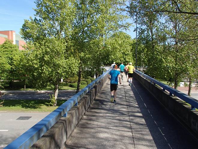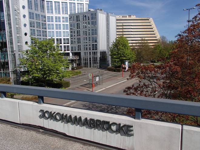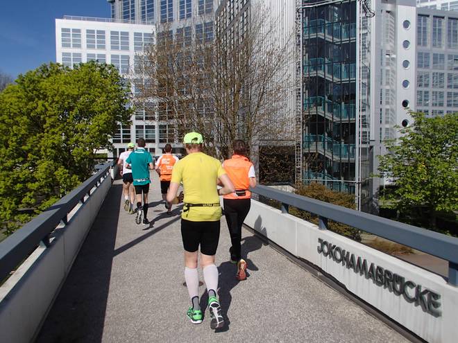 City Nord 9.42 Uhr Etwas überrascht war ich, daß Start und Ziel nicht an der Post-Pyramide lagen, sondern 400 Meter entfernt an der Jokohamabrücke. |