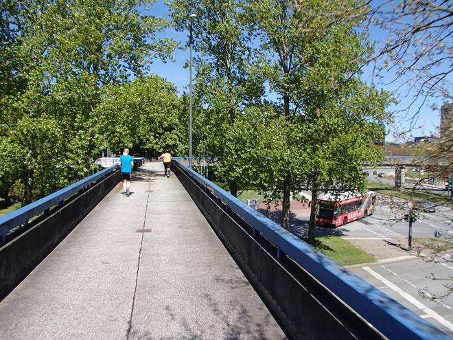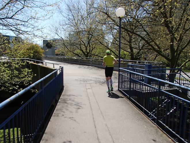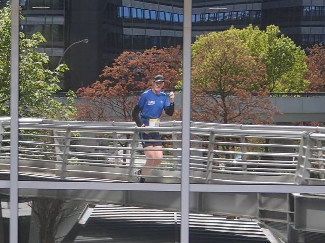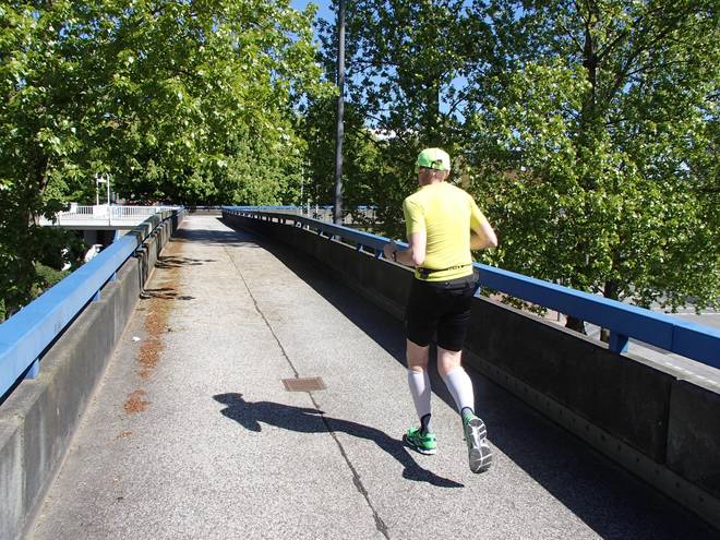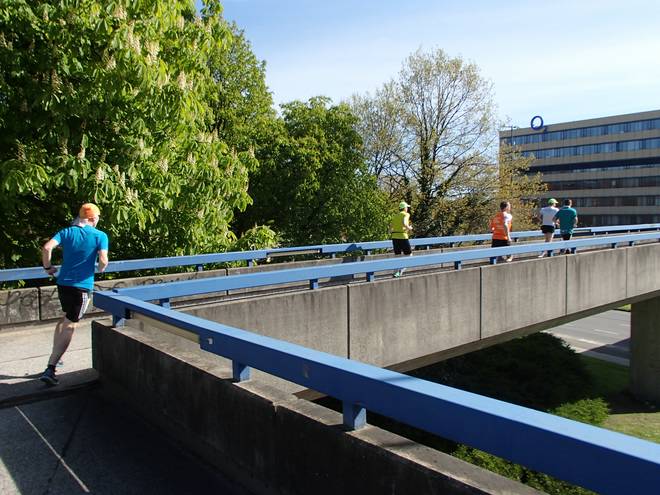Runde 5 10.34 Uhr / Km 3,9 So kann es gehen. Da wollte ich eigentlich einen ganz ruhigen Marathon über die Brücken laufen und ging schon nach vier von 48 Runden das Kämpfen um die Zeit los. |