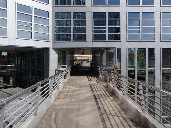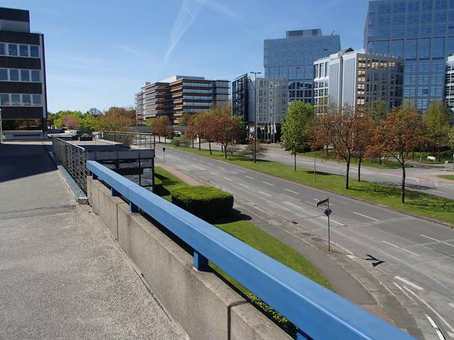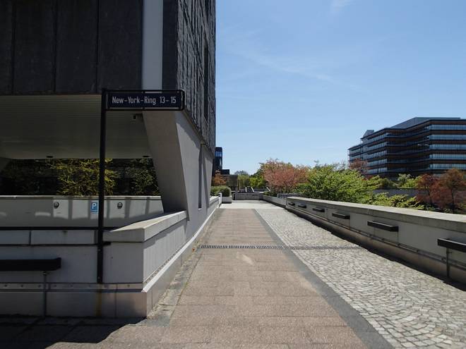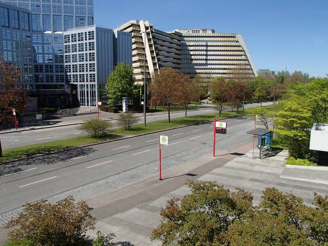 City Nord 9.48 Uhr Nichts desto trotz sind in der City Nord immer noch rund 300 Unternehmen mit 20000 Beschäftigten angesiedelt. An Wochenenden und an Feiertagen ist die City Nord praktisch menschenleer und dient allenfalls noch als Parkplatz für den nahen Stadtpark. |