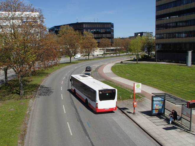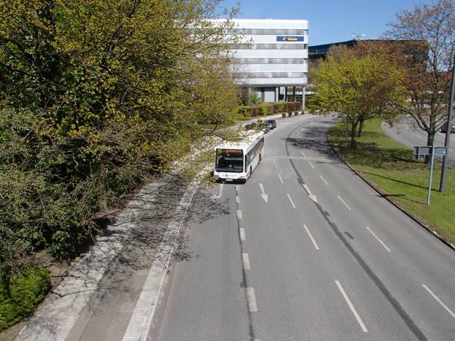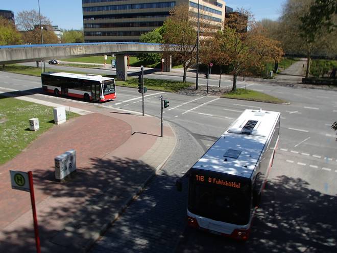 Runde 36 13.07 Uhr / Km 31,4 Menschen waren zwar kaum in der City Nord unterwegs, Busse dafür um so mehr. Ganz rechts auf dem Foto kann man die blauen Striche des Hamburg-Marathons erkennen. |
