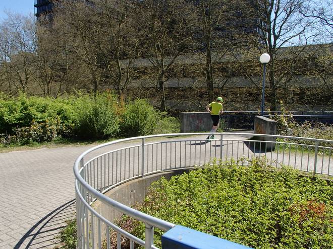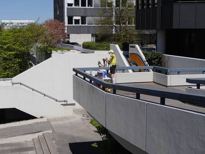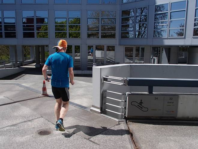 Runde 1 10.11 Uhr / Km 0,4 So war der Kurs sehr flach. Eine kurze Rampe direkt beim Verpflegungsstand und sechs Stufen runter. Statt der Rampe rauf konnte man auch Stufen wählen und statt der Stufen runter eine Rampe, war aber beides nicht sinnvoll. |