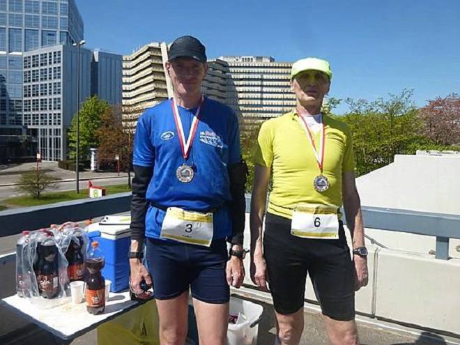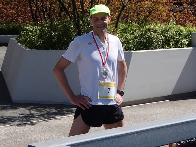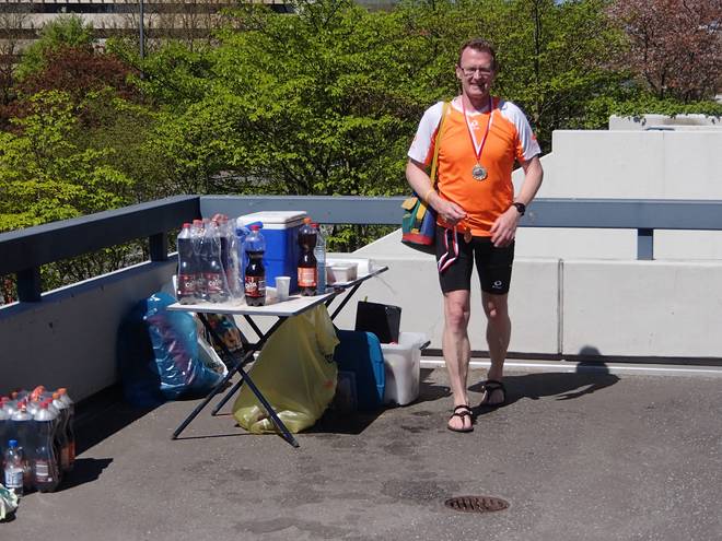 Finish 14.08 Uhr / Km 42,446 ... und geschafft. Ralf wartete schon mit der Medaille auf mich. |