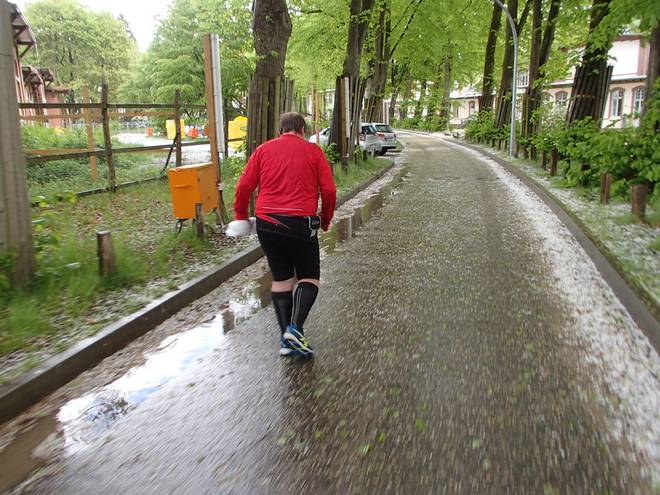 Runde 9 11.25 Uhr / Km 12,6 Wobei das vielleicht auch gar nicht so schlimm war, denn die Hagelkörner taten ziemlich weh. Selbst durch mein recht festes Cappy waren sie zu spüren. Und die dicksten Dinger waren noch nicht einmal dabei, bevor ich auf dem Klo war. |