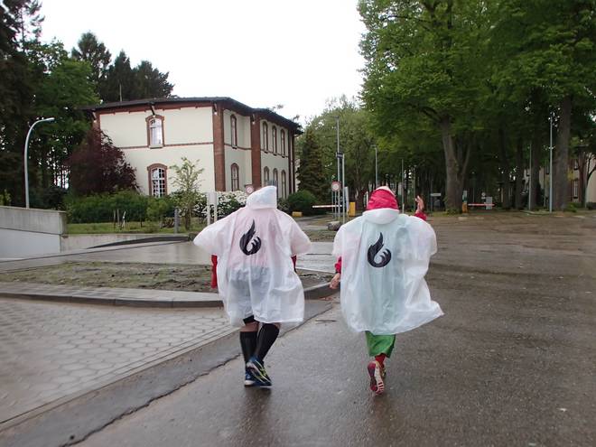 Runde 14 12.09 Uhr / Km 19,1 Die Olympia-Idee war noch nicht ganz aus Hamburg vertrieben worden. Auf ein paar Ponchos, die Christian kostenlos zur Verfügung stellte, lebte sie weiter. Die Ponchos waren Reste vom Ringe-Spektakel im Stadtpark am 8. November 2015. |