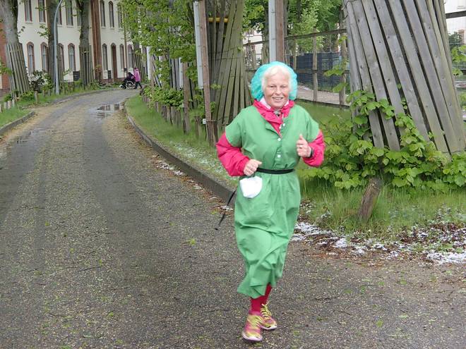 Runde 17 12.33 Uhr / Km 23,2 Christine arbeitete 25 Jahre lang an dieser Klinik als Schwester und lief in ihrer alten Dienstkleidung als Intensiv-Schwester. |