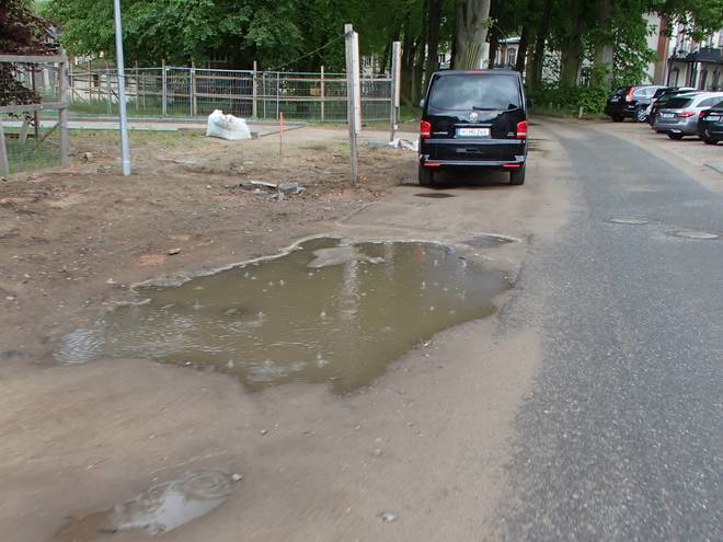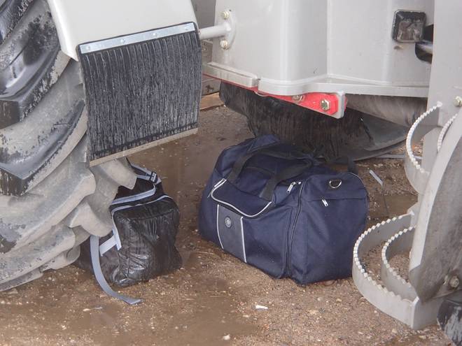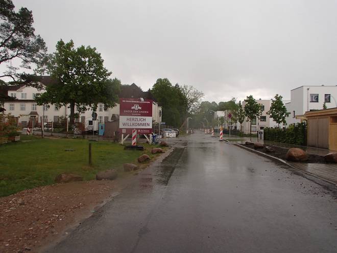 Ochsenstieg / Jütlandring 14.22 Uhr Die Idee, die Taschen unter dem großen Bauwagen zu stellen, war an sich gut. Aber wirklich trocken blieben die Taschen auch dort nicht. |