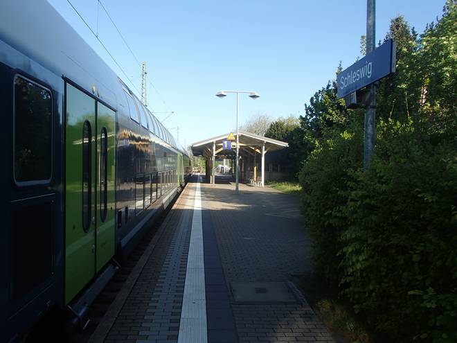 Bahnhof Schleswig 8.33 Uhr 4:25 Uhr Aufstehen, 5.13 Uhr aus dem Haus, mit der U-Bahn zum Hamburger Hauptbahnhof, mit der Bahn nach Neumünster und dann weiter nach Schleswig. |