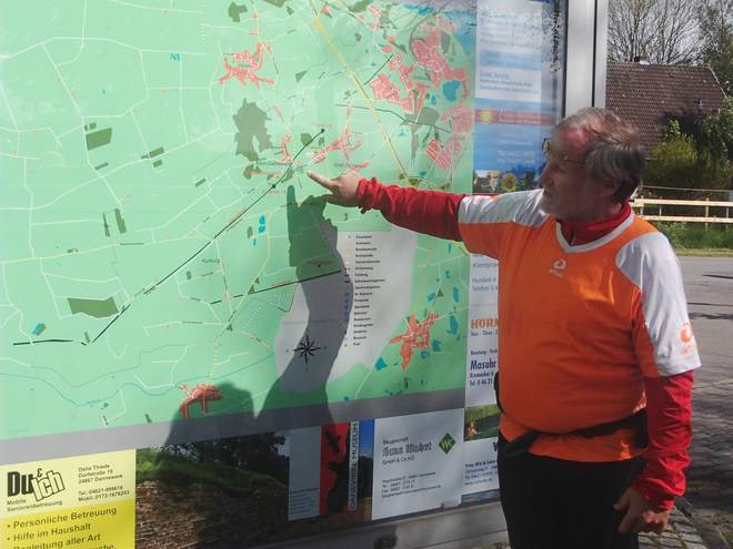 Hauptstraße / Ochsenweg Dannewerk 9.57 Uhr An der Karte erklärte Christian dann den Verlauf der 10,65 Kilometer, die viermal zu laufen waren. |