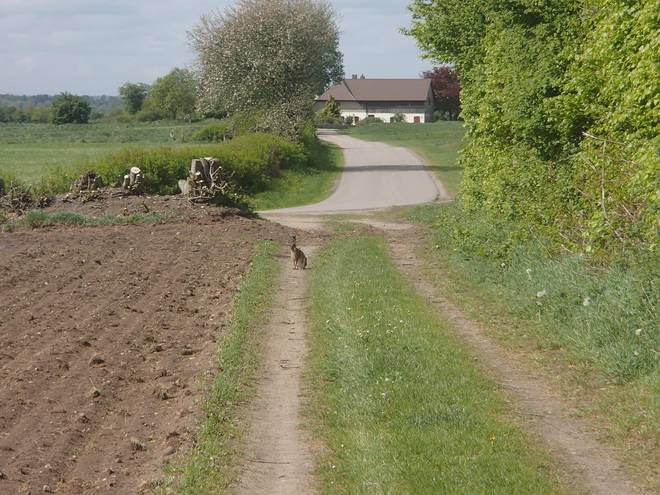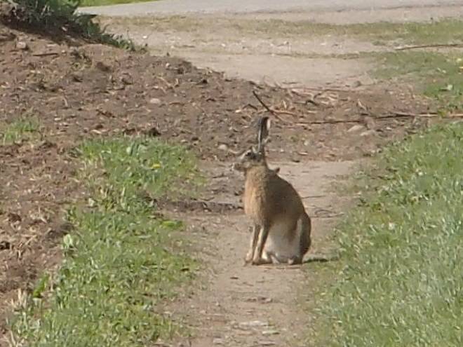 Hauptwall Runde 1 10.41 Uhr / Km 4,5 (Noch) Ein Ha(a)se auf der Strecke. Dieses kam uns sogar erst flott entgegen gehoppelt. |