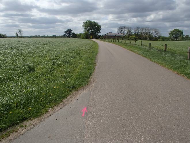 Hauptstraße / Ochsenweg Dannewerk 9.58 Uhr Das klang nicht zu schwer, ich bezweifelte allerdings, daß man die von Christian hervorgehobenen Punkt-Markierungen der Karte auf den tatsächlichen Wegen so wieder finden würde. Für alle Fälle war der Kurse mit Pfeilen markiert. |