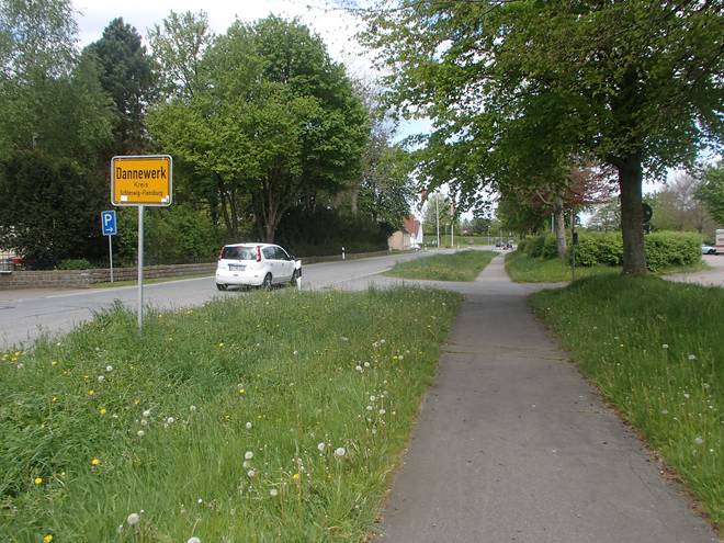 Hauptstraße / Ochsenweg Dannewerk 9.19 Uhr Nach 46 Minuten hatte ich mein Ziel erreicht. Da hatte ich weniger Zeit geplant, aber mit den Fotos war das wohl in Ordnung. Ich war ja nicht auf Tempo gewandert. |