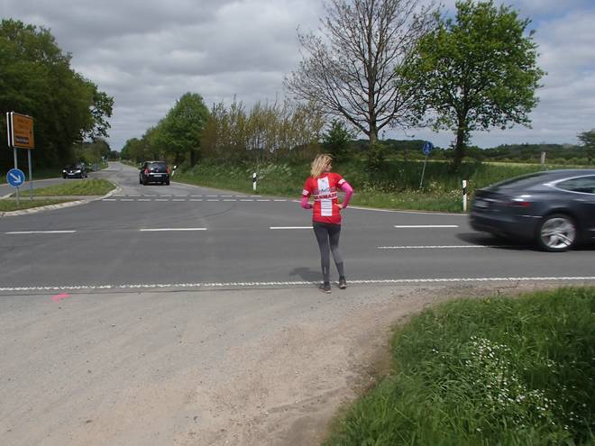 Rheider Weg Ochsenweg Runde 2 12.29 Uhr / Km 20,9 Dreimal je Runde mußte man eine Straße queren. So sehr viel Verkehr war nicht, man kam meist ohne langes Warten rüber. |