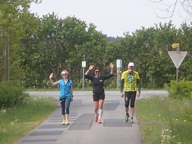 Hauptstraße / Ochsenweg Dannewerk 15.07 Uhr Die dänische Dreiergruppe mit Mie, Nicky und Dorthe (von links nach rechts) erreichten nach 5:03:56 Stunden das Ziel. Immer noch fröhlich. |