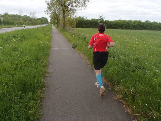 Flughafen Jagel Runde 3 13.15 Uhr / Km 28,5 Allmählich wurden mir die Beine schwerer. So zwei Marathons an zwei Tagen laufen sich halt nicht von alleine. Vorsichtshalber nahm ich mal etwas Tempo heraus. |