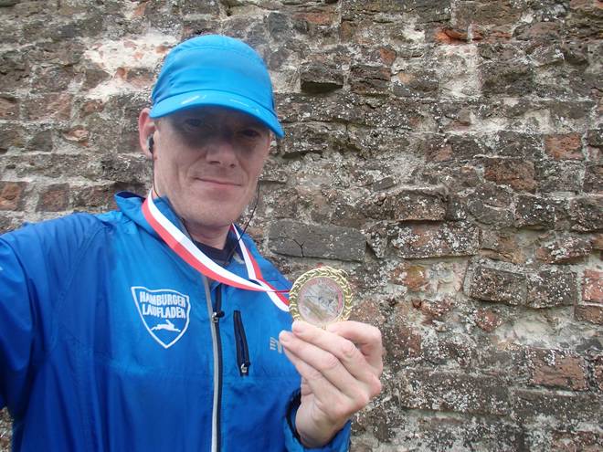 Waldemarsmauer Finish 14.46 Uhr / Km 42,6 Und noch ein Foto mit der Medaille. Ich konnte mich nicht entscheiden. |
