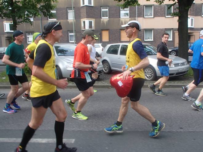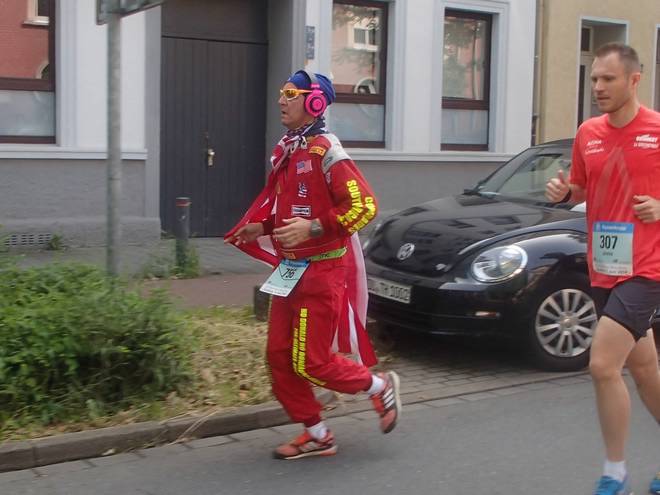 Pulverweg 10.03 Uhr / Km 4,3 Manch einer lief sogar bei dem Wetter noch verkleidet. Naja, sind auch nicht alle Läufer so hitzeempfindlich wie ich. |