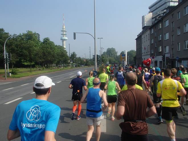 Neudorfer Straße 9.55 Uhr / Km 3,0 Die Vier-Stunden-Läufer hatte ich vorbei gelassen und lief nun in Sichtweite hinterher. Das Tempo vorne weg zu laufen war mir zu schwierig. Schräg voraus der Funkturm Duisburg. |