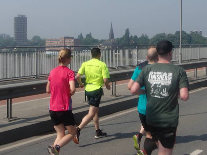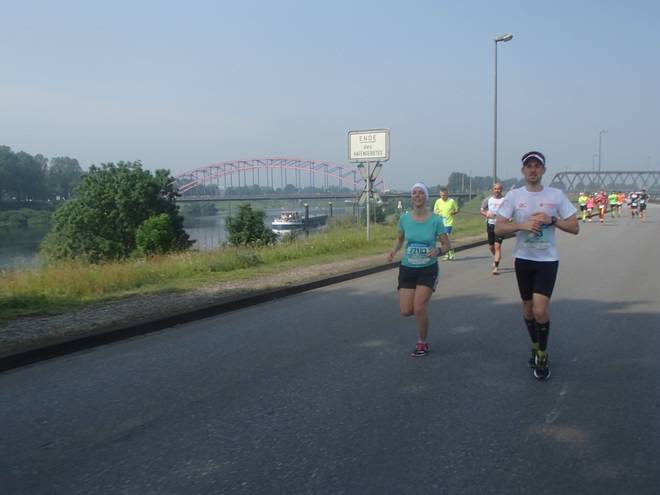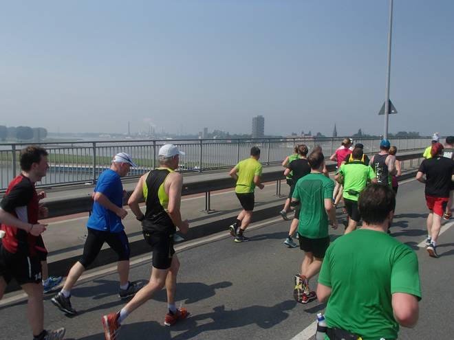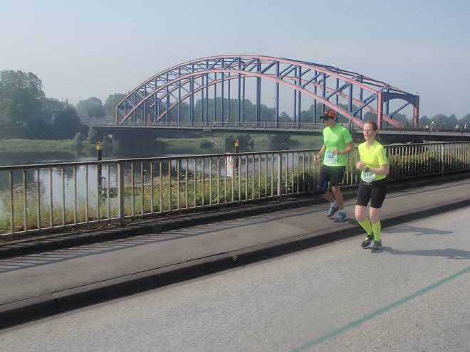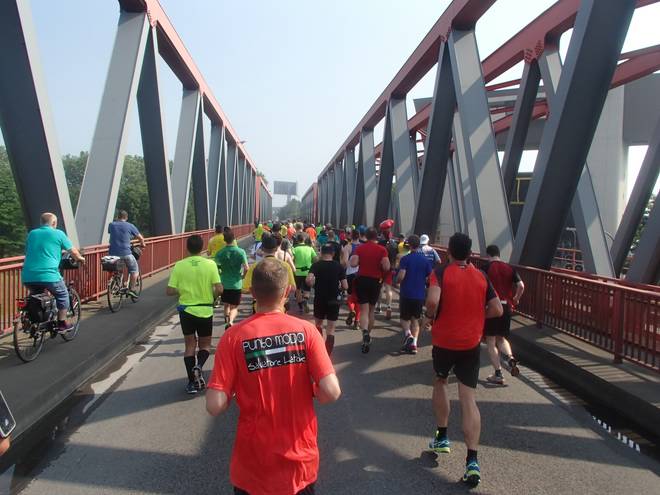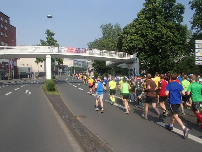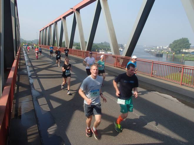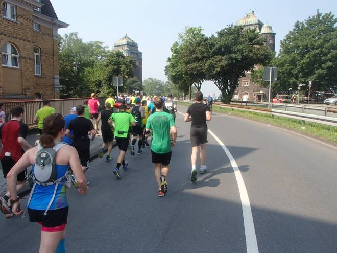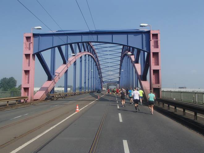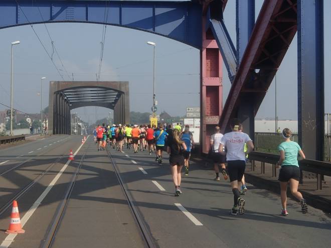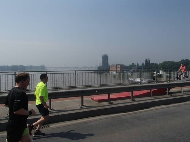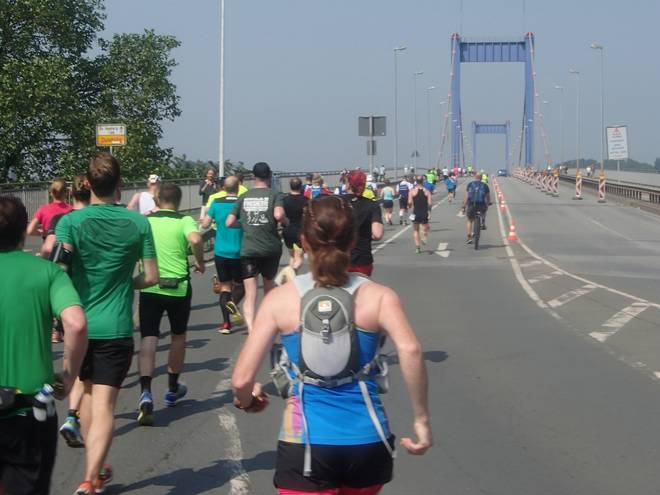 Friedrich-Ebert-Brücke 11.20 Uhr / Km 18,0 Bei der etwas schwer zu erkennende Brücke da hinten war die Halbmarathon-Marke. |