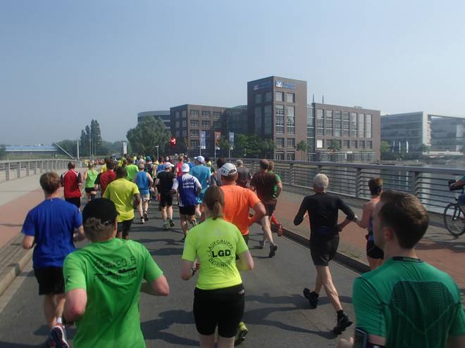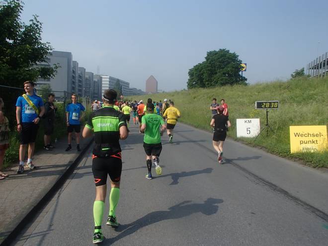 Am Innenhafen 10.07 Uhr / Km 5,0 28:14 Minuten. Das war sechs Sekunden schneller als der Vier-Stunden-Schnitt. Es lief also noch gut. |