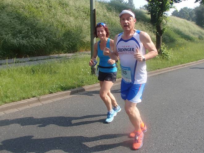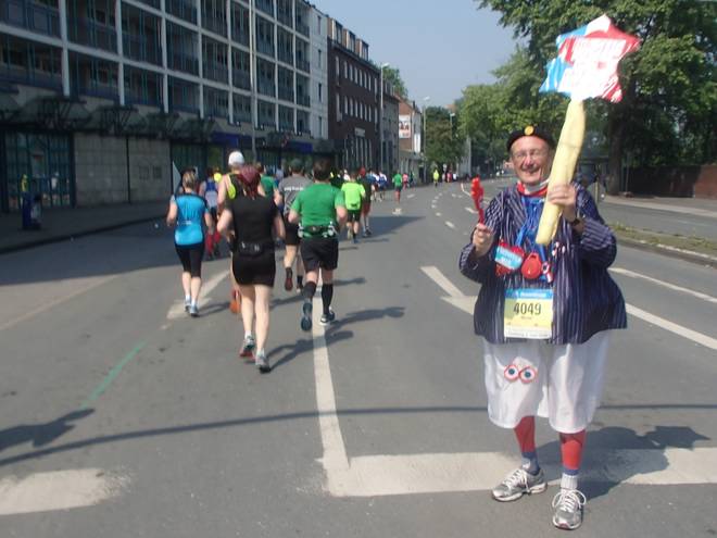 Kruppstraße 9.44 Uhr / Km 1,0 Ich hielt mich zu Beginn vor den Vier-.Stunden-Zeitläufern auf. Und traf auf ein bekanntes Gesicht. Mit Gabi war ich in Hamburg schon mehrere Marathons gelaufen. |