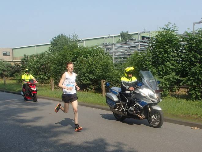 Pontwert 10.21 Uhr / Km 7,7 Das kam der Führende des Staffelmarathons durch das Marathon-Feld gejagt. Ich persönlich hätte ja die zwei Polizei-Motorräder vorne fahren lassen, um Platz zu schaffen, aber das muß ja jeder selbst entscheiden. |