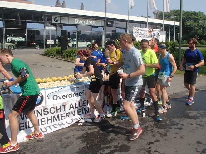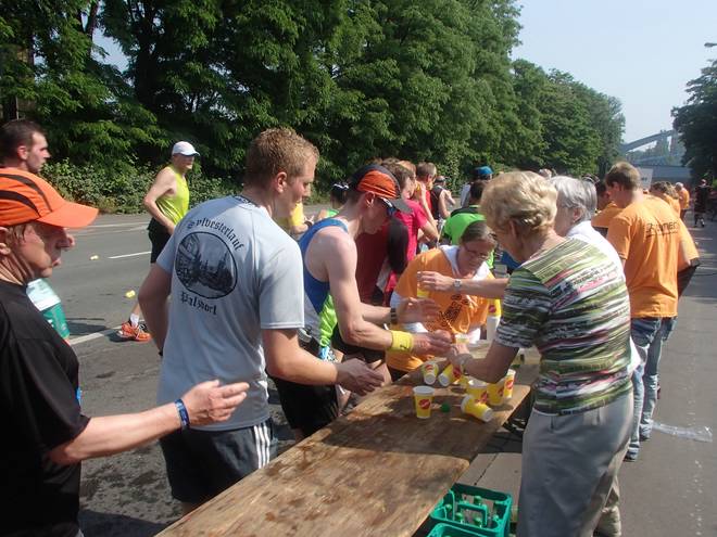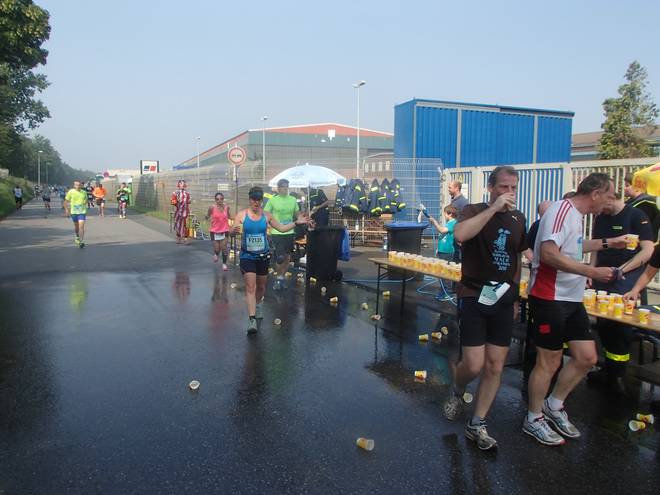 Pontwert 10.24 Uhr / Km 8,1 Der zweite von insgesamt 17 Verpflegungsständen. Wer im Juni Marathon laufen läßt, der der darf halt mit Hitze rechnen. |