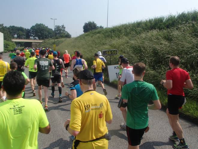 Kiffwart 10.35 Uhr / Km 10,0 56:31 Minuten nach den ersten zehn Kilometern. Mit 28:17 Minuten waren die zweiten fünf Kilometer drei Sekunden langsamer als die ersten fünf Kilometern. Aber noch paßte ja alles. An die Vier-Stunden-Läufer war ich inzwischen aufgelaufen. Die hatten sich nach den wohl etwas schnellen Kilometern zu Beginn nun zurückfallen lassen. |