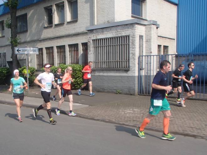 Sympherstraße 10.38 Uhr / Km 10,6 Den Hafen hatten wir hinter uns gelassen. Viele Läufer zog es hier auf den Bürgersteig, wo man ein wenig Schatten finden konnte. |