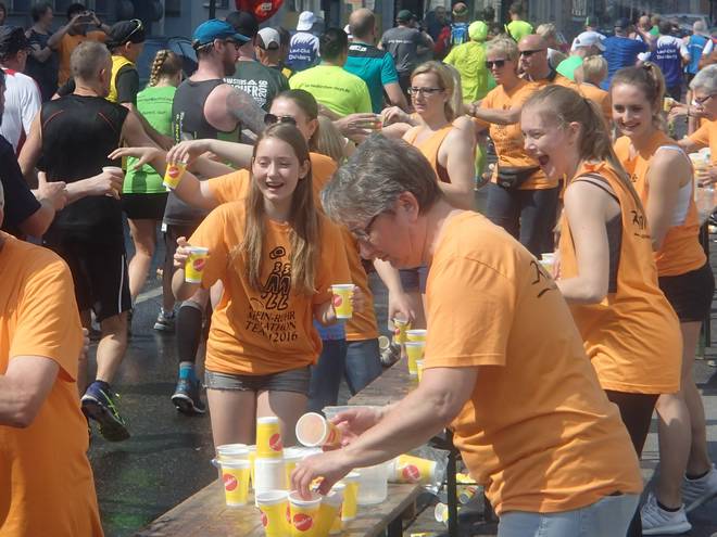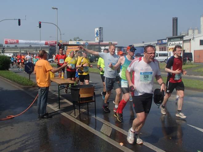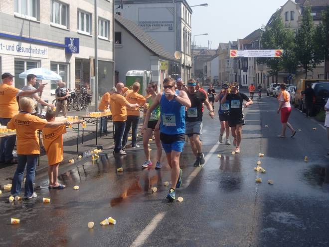 Bahnhofstraße 10.52 Uhr / Km 13,1 Verpflegungsstand Nr. 4. Hier hatte man sichtbar Spaß an der Arbeit mit dem Wasser. |