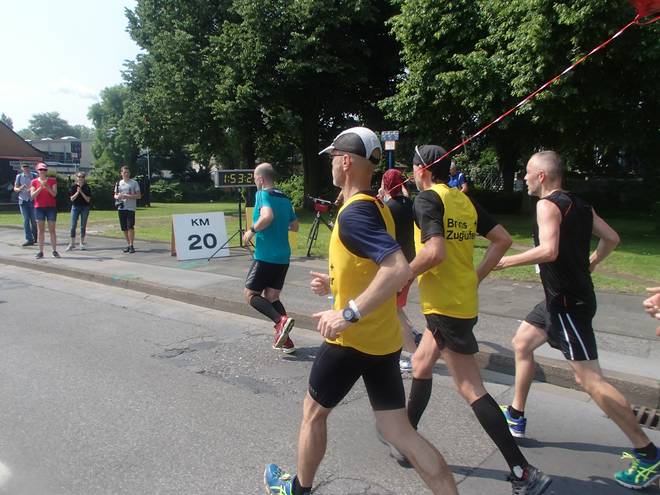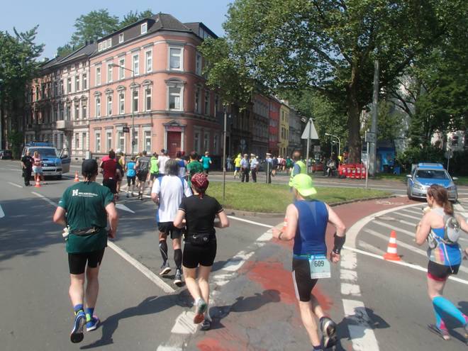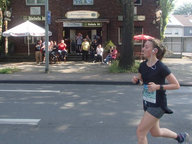 Duisburger Straße 11.31 Uhr / Km 20,0 1:52:57 Stunden. 23 Sekunden unter dem Schnitt. Bestens. Die vierten fünf Kilometer in 28:10 Minuten, minimal schneller als die Abschnitte zuvor. |