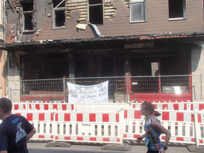 Unter den Ulmen 11.03 Uhr / Km 14,9 In diesem Haus erstickte 2014 eine dreiköpfige Familie als im China-Restaurant nachts ein Brand ausbrach. Ein paar Meter weiter brannte dann im Mai 2016 ein weiteres Haus. Dort gab es neben 30 Verletzten ebenfalls drei Tote. Solche Geschichten gehen einen auch beim Laufen nahe. |