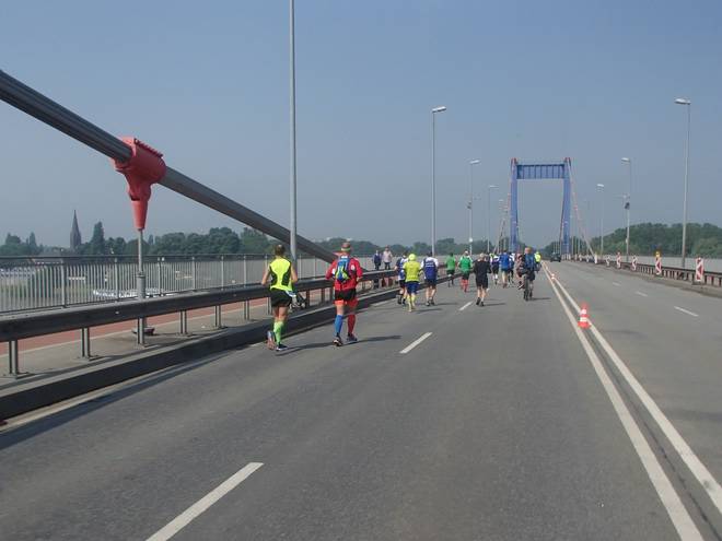 Friedrich-Ebert-Brücke 11.18 Uhr / Km 17,7 Auf der 599 Meter langen Brücke ging es nun über den Rhein. |
