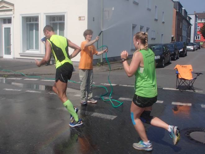 Sympherstraße 10.42 Uhr / Km 11,1 Verpflegungsstand Nr. 3. Zu Beginn erst einmal eine kühle Dusche per Wasserschlauch. |