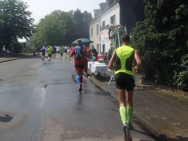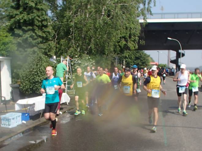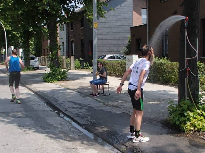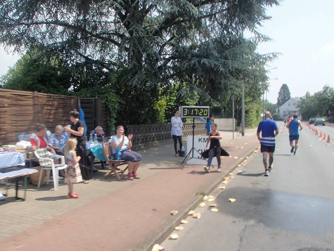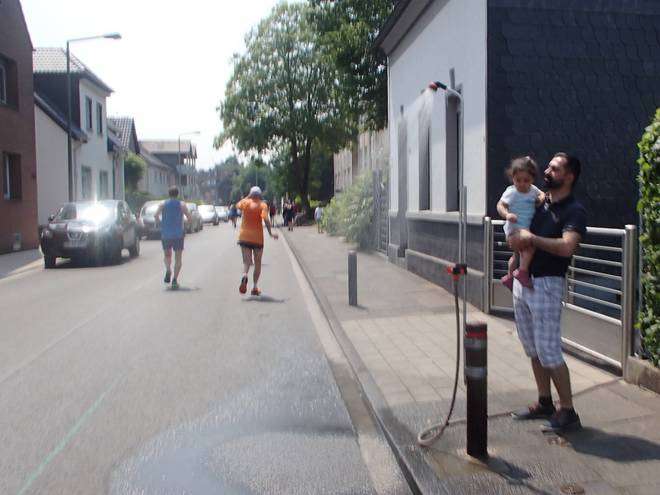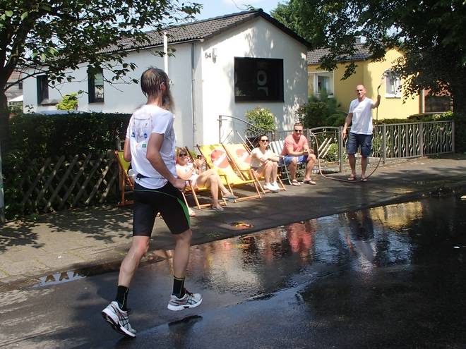 Düsseldorfer Straße 12.36 Uhr / Km 31,5 Verpflegungsstand Nr. 12. Und wieder die kühlende Dusche aus dem Gartenschlauch. |