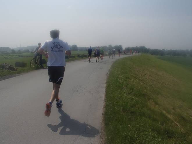 Deichstraße 11.45 Uhr / Km 22,3 Nun hätte ich ein trockenes Tuch oder so gebracht. Aber ich hatte längst nichts trockenes mehr an mir und sonst fand ich nichts hilfreiches. |