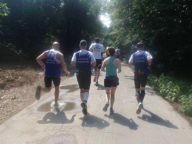 Rheinstraße 11.53 Uhr / Km 23,7 Ich war dem Zeitläufern nun etwas enteilt und hatte mich an diese Gruppe des Laufclub Duisburg angeschlossen. |
