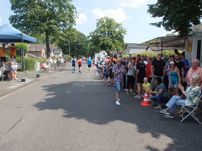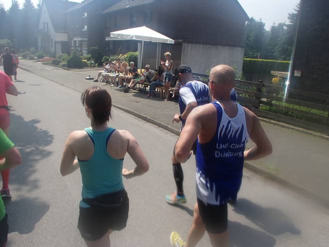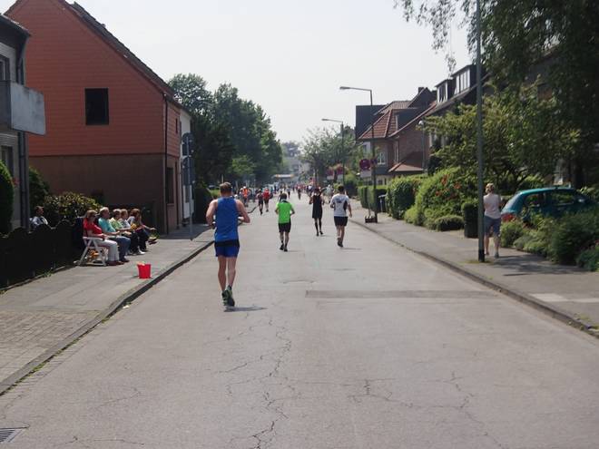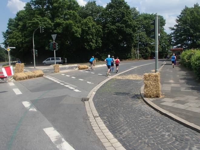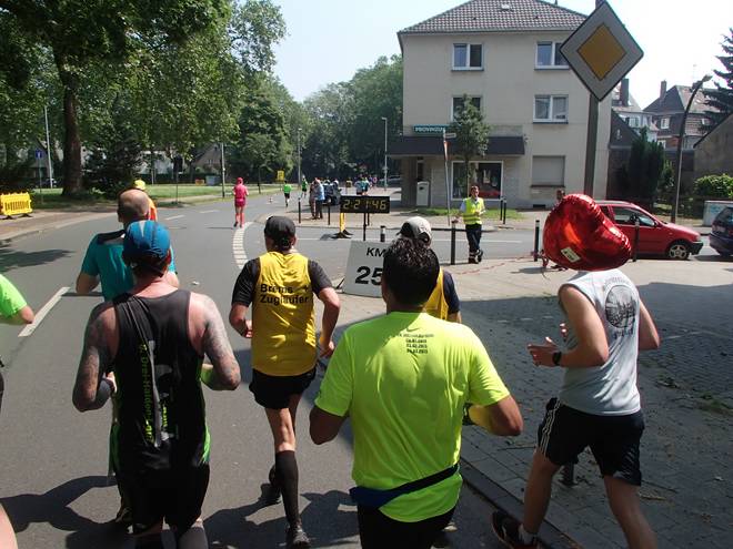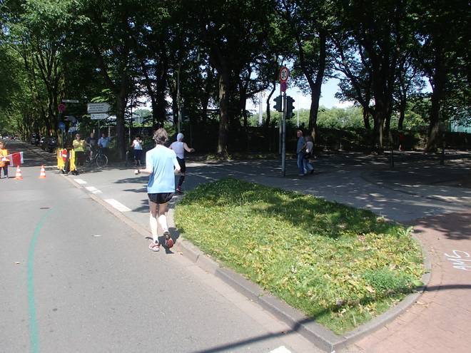 Düsseldorfer Straße 12.34 Uhr / Km 31,1 Laut Presse waren es "schwül-warme Wetterbedingungen mit bis zu 35°C". Das war dann doch ein wenig übertrieben oder in der Sonne gemessen. Aber die 27°C waren schon drückend genug. |