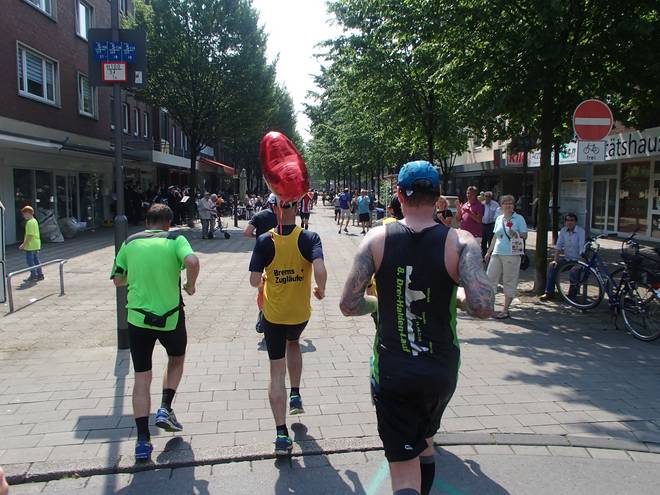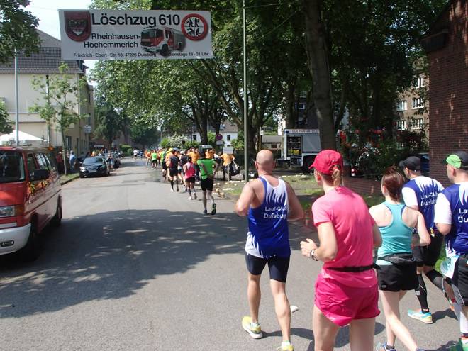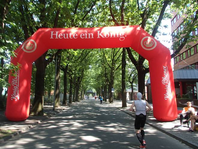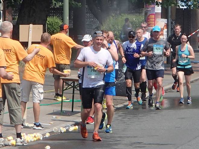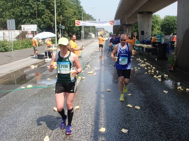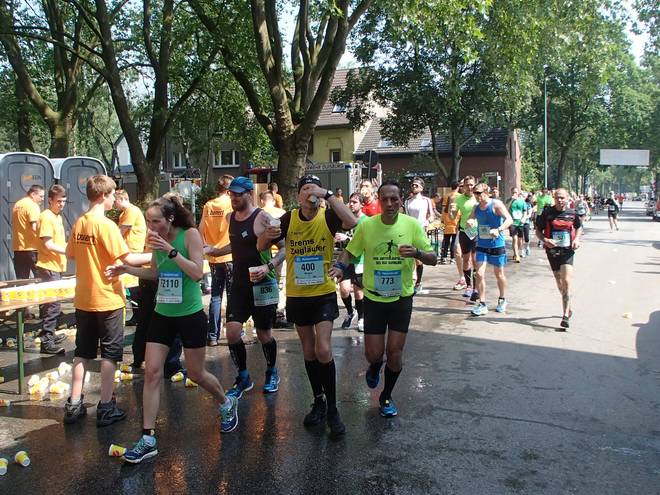 Karl-Jarre-Straße 12.19 Uhr / Km 28,4 Verpflegungsstand Nr. 10. Der kam überraschend schnell, aber nicht zu schnell. Vor allem die Wasserdusche kam mir gerade recht. |