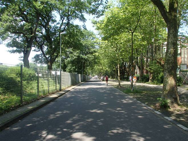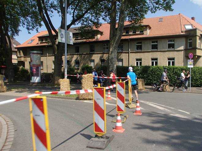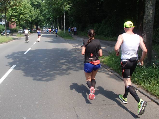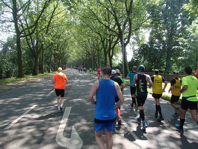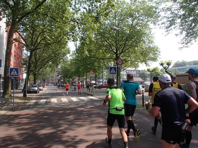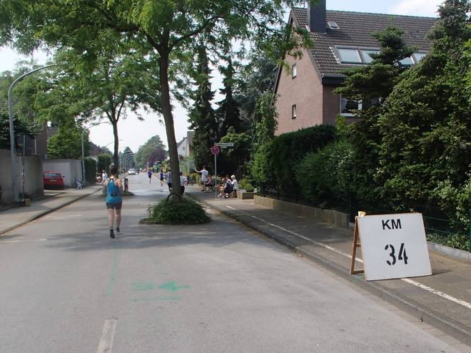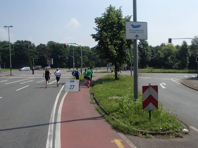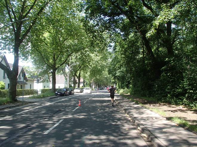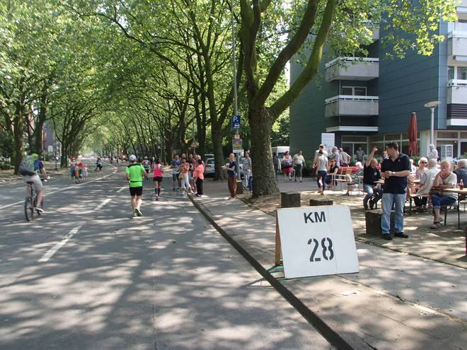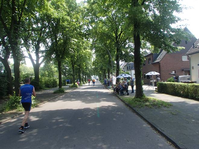 Karl-Jarre-Straße 12.17 Uhr / Km 28,0 Der Schatten tat gut. Am Verpflegungsstand hatten mich die Zeitläufern fast wieder eingeholt, aber nun zog ich flotten Schrittes davon. |