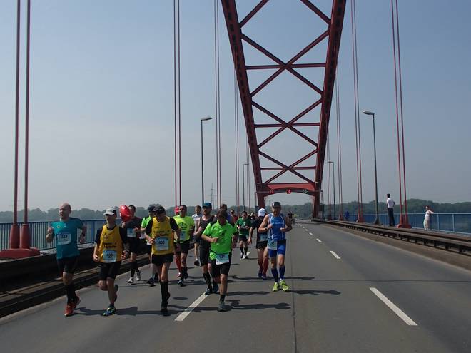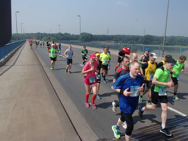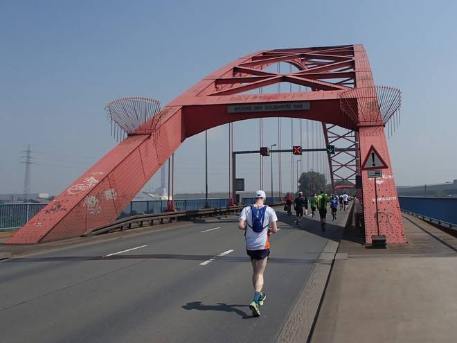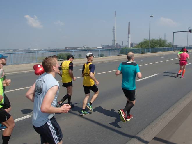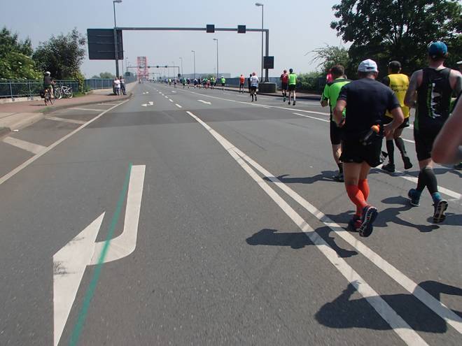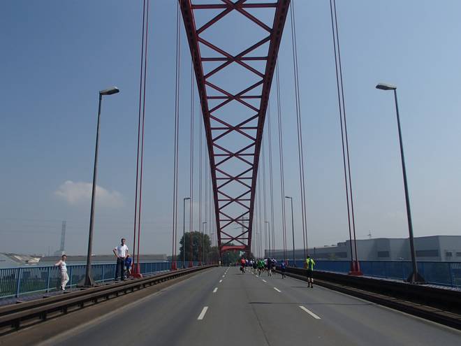 Moerser Straße Brücke der Solidarität 12.05 Uhr / Km 25,9 Zum zweiten Mal ging es über den Rhein. Irgendwie gab mir das neue Kraft. Jedenfalls lief ich nun wieder an den Vier-Stunden-Läufern vorbei. |