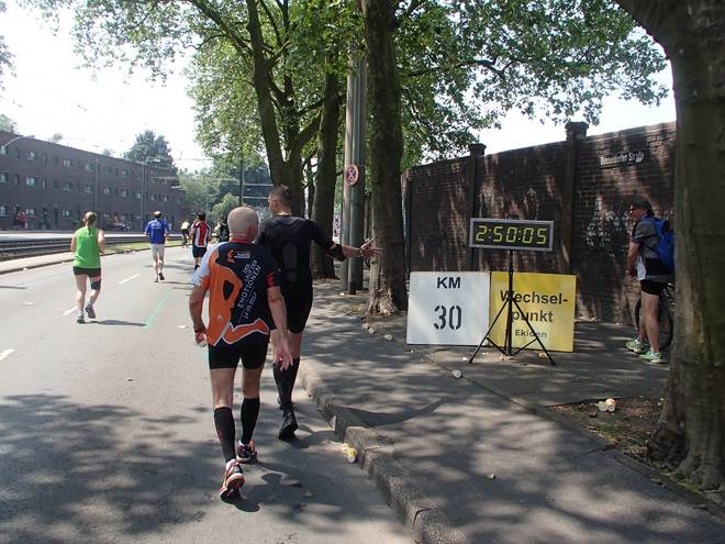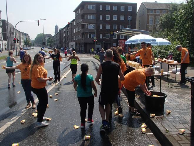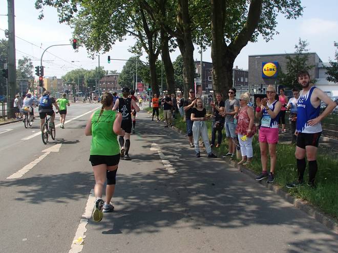 Düsseldorfer Straße 12.27 Uhr / Km 29,8 Verpflegungsstand Nr. 11. Also drei Verpflegungsstände auf 2,6 Kilometern war doch etwas zu viel des Guten. Aber bei noch sechs ausstehenden Ständen auf 12,4 Kilometern sollte niemand verdursten müssen. |