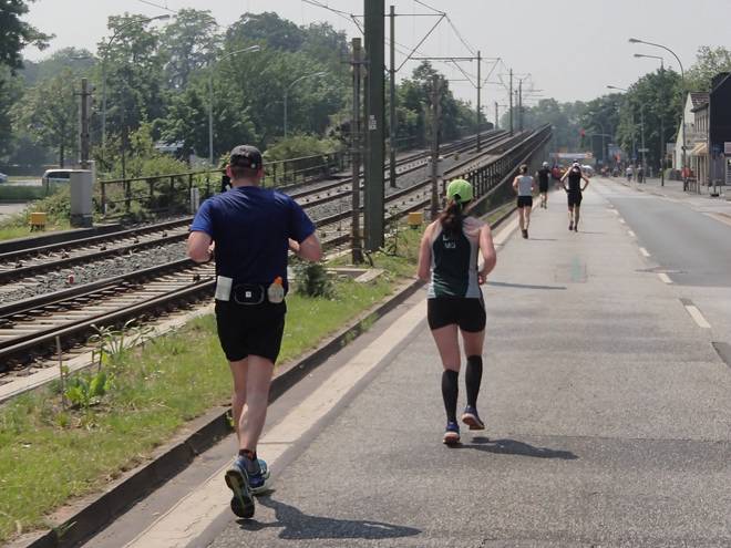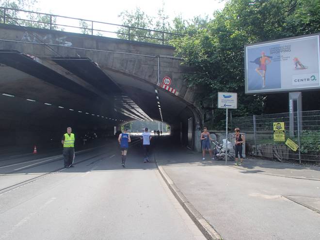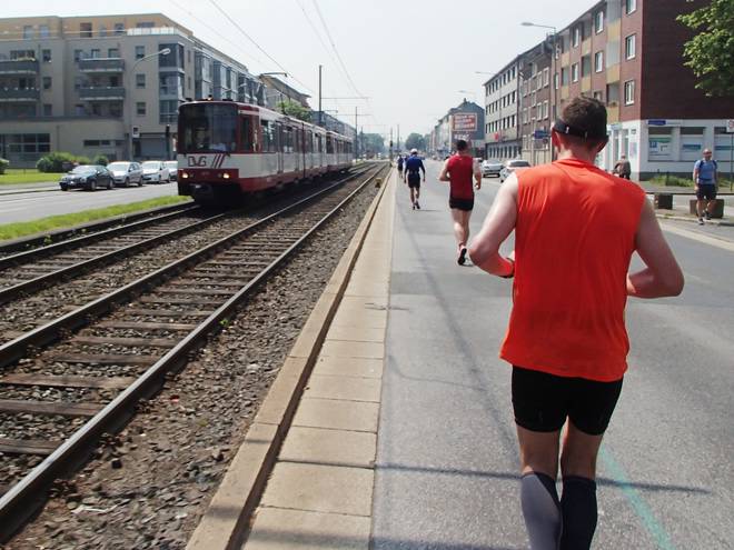 Düsseldorfer Straße 12.31 Uhr / Km 30,5 Bis Kilometer 31,5 hätte man die Bahn nehmen können. Allerdings fuhr diese hier in die falsche Richtung und ich glaube nicht, daß es in der Bahn kühler war als hier draußen. |