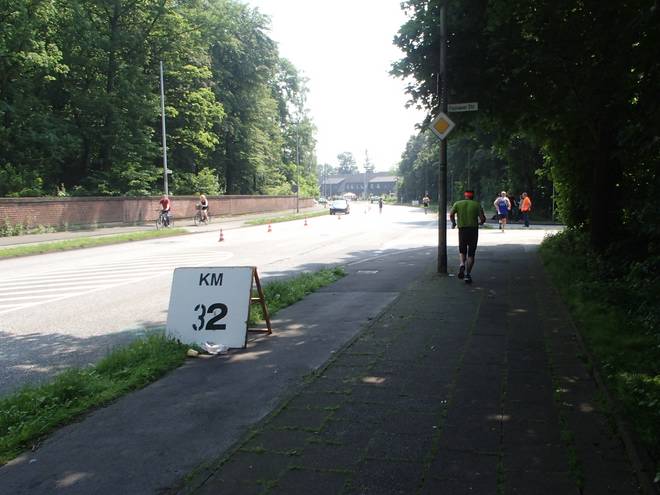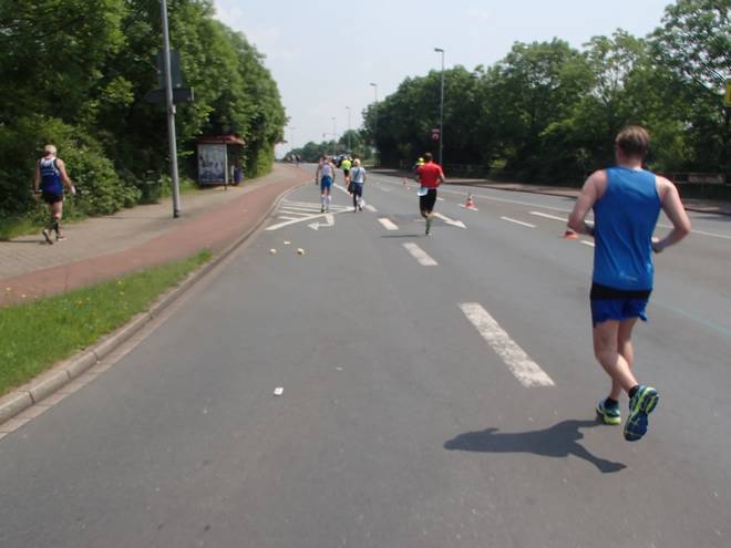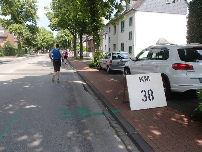 Wedauer Straße 12.39 Uhr / Km 32,0 Wieder war ein Kilometer geschafft. Aber noch immer mehr als zehn zu laufen. |