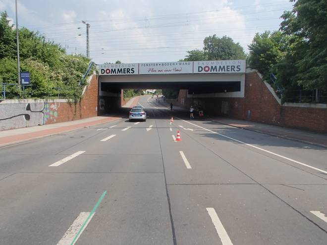 Altenbrucher Damm 12.56 Uhr / Km 35,1 Ach ja, da war doch noch was. Diese verfluchte Autobahn-Eisenbahn-Kombination hinter Kilometer 35. Erst ging es bergauf und dann über die Autobahn A59 hinweg. |
