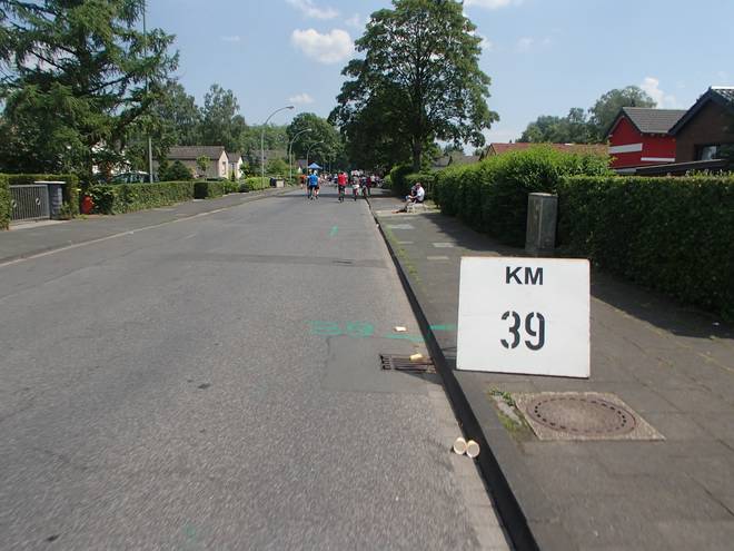 Großenbaumer Allee 13.12 Uhr / Km 38,0 Und plötzlich waren es nur noch 4,2 Kilometer. Der vorhandene Zeit-Puffer wurde damit immer wertvoller und es sah alles so aus, als würde ich unter vier Stunden bleiben können. |