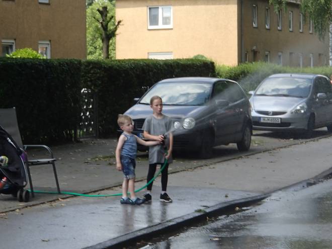 Großenbaumer Allee 13.11 Uhr / Km 37,8 Die nächste Privat-Dusche. Mehr als Dankbar nahm ich jede Abkühlung an. Ich sage ja immer: die wahren Wasserschlachten finden nicht bei Regen statt, sondern bei solcher Hitze. |