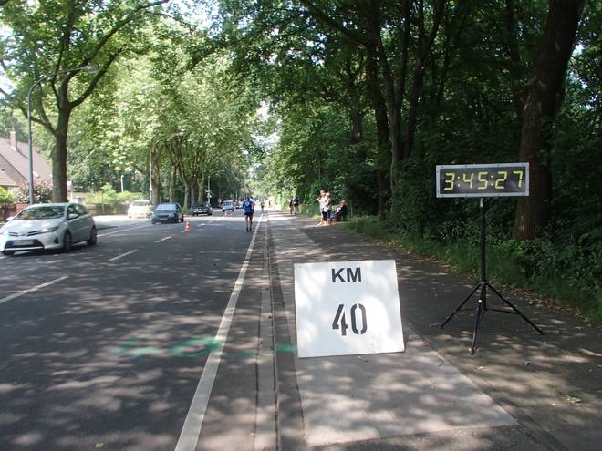 Kalkweg 13.23 Uhr / Km 40,0 3:45:01 Stunden auf der Uhr. Fast 15 Minuten Zeit für die letzten 2,195 Kilometer. 28:05 Minuten dauerten meine achten fünf Kilometer. Trotz der deutlichen Probleme und des verminderten Tempos noch immer 15 Sekunden schneller als der Vier-Stunden-Schnitt. |
