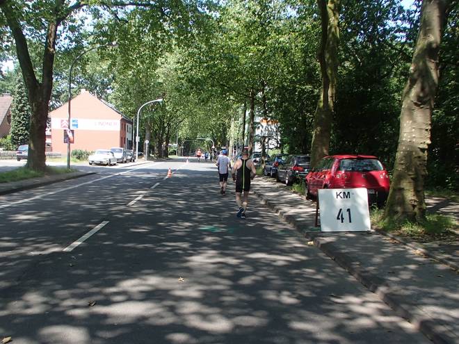 Großenbaumer Allee 13.08 Uhr / Km 37,3 Ein wenig hatte ich jetzt das Tempo gedrosselt. Die Beine wurde immer schwerer. Ich guckte aber immer, ob ich noch im Schnitt blieb. Und hatte ich immer noch 84 Sekunden Zeit-Puffer. |